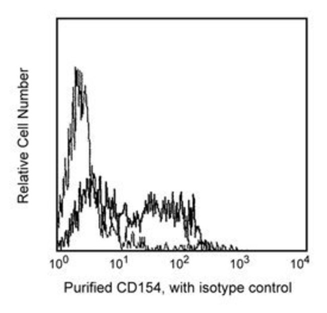 Reacts with CD40 ligand (CD40L), a 39kDa type II membrane glycoprotein expressed on activated T cells. CD40-CD40L interaction plays a very important role in T cell-dependent B-cell proliferation, differentiation, and memory cell formation. Anti-CD40L mAb partially blocks T cell-B cell interaction affecting subsequent proliferation, differentiation, and memory cell formation. Anti-CD40L mAb partially blocks T cell-B cell interaction affecting subsequent proliferation, IL-2R expression and differentiation of B cells. In addition, blocking of CD40-CD40L interaction has been demonstrated with soluble CD40, resulting in the inhibition of immunoglobulin isotype switching. It has been reported that patients with X-linked hyper-IgM syndrome have defective expression of functional CD40L due to a defective gene that encodes CD40L. This antibody is routinely tested by flow cytometric analysis. Other applications were tested at BD Biosciences Pharmingen during antibody development only or reported in the literature.