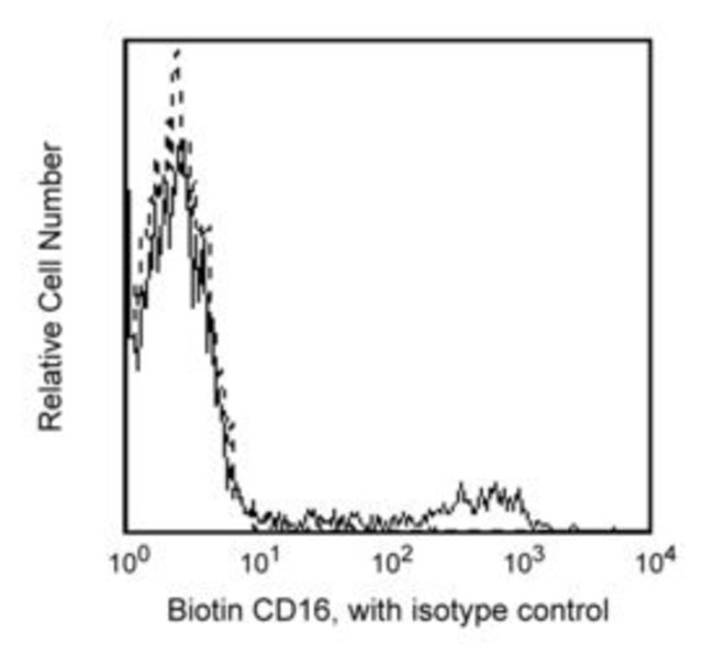 Reacts with the 50-65kDa transmembrane form of IgG Fc (FcRIII), a human NK-cell-associated antigen. CD16 is expressed on NK cells as well as macrophages and granulocytes. Reports indicate that CD16 plays a role in signal transduction and NK cell activation. CD16 antibody blocks the binding of soluble immune complexes to granulocytes. This antibody is routinely tested by flow cytometric analysis. Other applications were tested at BD Biosciences Pharmingen during antibody development only or reported in the literature.