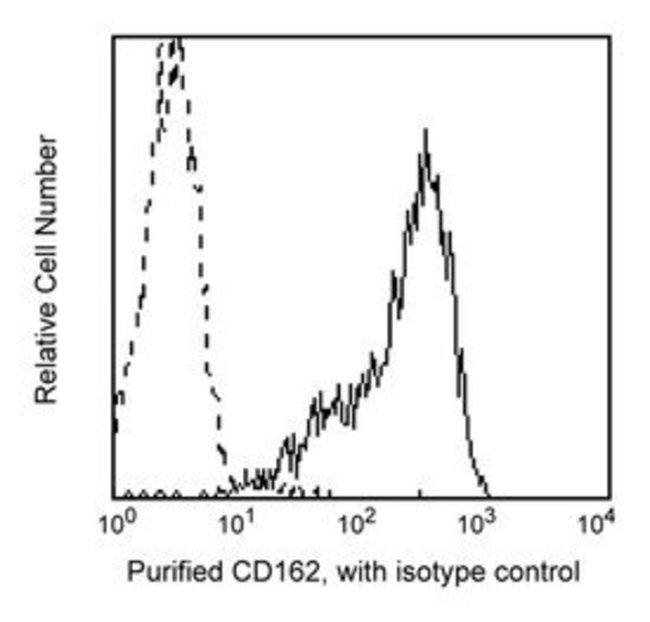 Reacts with p-selectin glycoprotein ligand-1 (PSGL-1), a 120 - 220kDa, mucin-like type I transmembrane glycoprotein. CD162 is expressed on neutrophils, monocytes, and most lymphocytes. CD162 binds to CD62P (P-Selectin), CD62E (E-Selectin) and CD62L (L-Selectin). This molecule mediates rolling of leukocytes on activated endothelium and the interaction between leukocytes and activated platelets or other leukocytes found at inflammatory sites. It has also been reported that this clone completely inhibits the interaction between P-Selectin and either CD4-T cells or neutrophils. This antibody is routinely tested by flow cytometric analysis. Other applications were tested at BD Biosciences Pharmingen during antibody development only or reported in the literature.