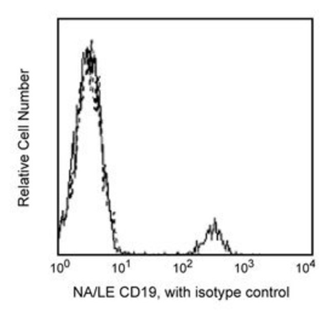 Reacts with the 95kDa type I transmembrane glycoprotein expressed during all stages of B-cell differentiation and maturation, except on plasma cells. CD19 is also present on follicular dendritic cells. It is not found on T cells or on normal granulocytes. CD19 plays a role in regulation of B-cell proliferation. It associates with the complement receptor 2 (CD21), TAPA-1 (CD81), Leu 13, and/or MHC class II to form a signal transduction complex on the surface of B cells. Anti-CD19 clone HIB19 partially blocks clone B43, another C19 mAb. This antibody is routinely tested by flow cytometric analysis. Other applications were tested at BD Biosciences Pharmingen during antibody development only.