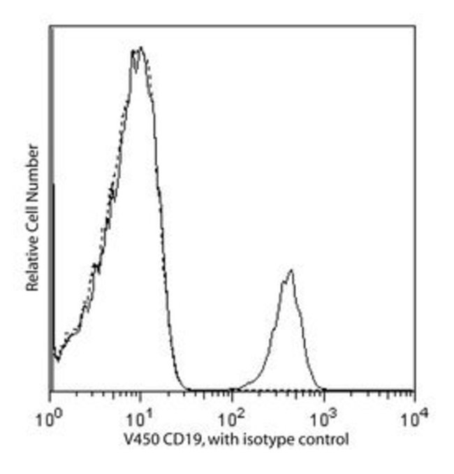 Reacts with the 95kDa type I transmembrane glycoprotein expressed during all stages of B-cell differentiation and maturation, except on plasma cells. CD19 is also present on follicular dendritic cells. It is not found on T cells or on normal granulocytes. CD19 plays a role in regulation of B-cell proliferation. It associates with the complement receptor 2 (CD21), TAPA-1 (CD81), Leu 13, and/or MHC class II to form a signal transduction complex on the surface of B cells. Anti-CD19 clone HIB19 partially blocks clone B43, another C19 mAb. The antibody is conjugated to BD Horizon™ V450, which has been developed for use in multicolor flow cytometry experiments and is available exclusively from BD Biosciences. It is excited by the Violet laser Ex max of 406nm and has an Em Max at 450nm. Conjugates with BD Horizon™ V450 can be used in place of Pacific Blue™ conjugates.Host Species: MouseClone: HIB19Isotype: IgG1 κSpecies Reactivity: HumanFlow Cytometry
