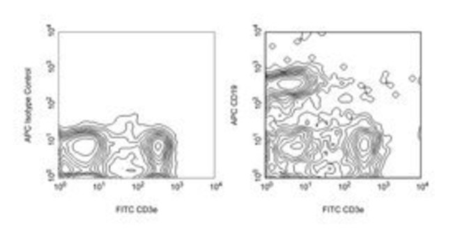 The 1D3 antibody reacts with CD19, a B lymphocyte-lineage differentiation antigen. CD19, a 95-kDa transmembrance glycoprotein, is a member of the immunoglobulin superfamily and is expressed throughout B-lymphocyte development from the pro-B cell throughthe mature B-cell stages. Terminally differentiated plasma cells do not express CD19. On the surface of mature B cells, the CD19 molecule associates with CD21 (CR-2) and CD81 (TAPA-1), and this multimolecular complex synergizes with surface immunoglobulin to promote cellular activation. Studies with CD19-deficient mice have suggested that the level of CD19 expression affects the generation and maturation of B cells in the bone marrow and periphery. B-1 lineage B cells, also known as CD5+ B cells, are drastically reduced or absent in CD19-deficient mice. Increased levels of CD19 expression correlate with increased frequencies of peritonal and splenic B-1 cells and reduced numbers of conventional B lymphocytes in the periphery. CD19 participates in B-lymphocyte development, B-cell activation, maturation of memory B cells and regulation of tolerance. CD19 has also been detected on peritoneal mast cells, co-localized with CD21/CD35, and it is proposed to play a role in complement-mediated mast-cell activation.