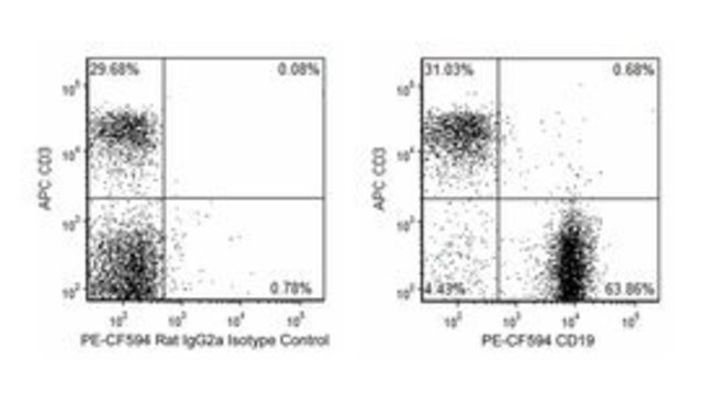 The 1D3 antibody reacts with CD19, a B lymphocyte-lineage differentiation antigen. CD19, a 95-kDa transmembrance glycoprotein, is a member of the immunoglobulin superfamily and is expressed throughout B-lymphocyte development from the pro-B cell throughthe mature B-cell stages. Terminally differentiated plasma cells do not express CD19. On the surface of mature B cells, the CD19 molecule associates with CD21 (CR-2) and CD81 (TAPA-1), and this multimolecular complex synergizes with surface immunoglobulin to promote cellular activation. Studies with CD19-deficient mice have suggested that the level of CD19 expression affects the generation and maturation of B cells in the bone marrow and periphery. B-1 lineage B cells, also known as CD5 B cells, are drastically reduced or absent in CD19-deficient mice. Increased levels of CD19 expression correlate with increased frequencies of peritonal and splenic B-1 cells and reduced numbers of conventional B lymphocytes in the periphery. CD19 participates in B-lymphocyte development, B-cell activation, maturation of memory B cells and regulation of tolerance. CD19 has also been detected on peritoneal mast cells, co-localized with CD21/CD35, and it is proposed to play a role in complement-mediated mast-cell activation. This antibody is conjugated to BD Horizon™ PE-CF594, which has been developed exclusively by BD Biosciences as a better alternative to PE-Texas Red. PE-CF594 excites and emits at similar wavelengths to PE-Texas Red yet exhibits improved brightness and spectral characteristics. Due to PE having maximal absorption peaks at 496nm and 564nm, PE-CF594 can be excited by the blue (488-nm), green (532-nm) and yellow-green (561-nm) lasers and can be detected with the same filter set as PE-Texas Red (eg 610/20-nm filter).