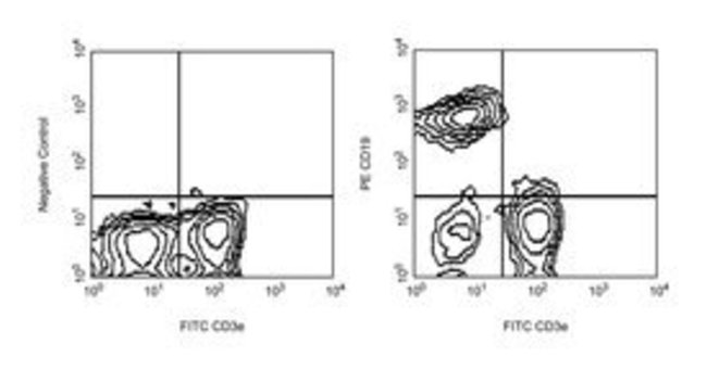 The 1D3 antibody reacts with CD19, a B lymphocyte-lineage differentiation antigen. CD19, a 95kDa transmembrance glycoprotein, is a member of the immunoglobulin superfamily and is expressed throughout B-lymphocyte development from the pro-B cell through the mature B-cell stages. Terminally differentiated plasma cells do not express CD19. On the surface of mature B cells, the CD19 molecule associates with CD21 (CR-2) and CD81 (TAPA-1), and this multimolecular complex synergizes with surface immunoglobulin to promote cellular activation. Studies with CD19-deficient mice have suggested that the level of CD19 expression affects the generation and maturation of B cells in the bone marrow and periphery. B-1 lineage B cells, also known as CD5+ B cells, are drastically reduced or absent in CD19-deficient mice. Increased levels of CD19 expression correlate with increased frequencies of peritonal and splenic B-1 cells and reduced numbers of conventional B lymphocytes in the periphery. CD19 participates in B-lymphocyte development, B-cell activation, maturation of memory B cells and regulation of tolerance. CD19 has also been detected on peritoneal mast cells, co-localized with CD21/CD35, and it is proposed to play a role in complement-mediated mast-cell activation. This antibody is routinely tested by flow cytometric analysis and is compatible with intracellular staining protocols using the BD Cytofix/Cytoperm™ Kit (Mfr. No. 554714). Other applications were tested at BD Biosciences Pharmingen during antibody development only or reported in the literature.Host Species: RatClone: 1D3Isotype: IgG2a, κCross Reactivity: MouseFlow Cytometry