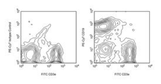 The 1D3 antibody reacts with CD19, a B lymphocyte-lineage differentiation antigen. CD19, a 95-kDa transmembrance glycoprotein, is a member of the immunoglobulin superfamily and is expressed throughout B-lymphocyte development from the pro-B cell through the mature B-cell stages. Terminally differentiated plasma cells do not express CD19. On the surface of mature B cells, the CD19 molecule associates with CD21 (CR-2) and CD81 (TAPA-1), and this multimolecular complex synergizes with surface immunoglobulin to promote cellular activation. Studies with CD19-deficient mice have suggested that the level of CD19 expression affects the generation and maturation of B cells in the bone marrow and periphery. B-1 lineage B cells, also known as CD5+ B cells, are drastically reduced or absent in CD19-deficient mice. Increased levels of CD19 expression correlate with increased frequencies of peritonal and splenic B-1 cells and reduced numbers of conventional B lymphocytes in the periphery. CD19 participates in B-lymphocyte development, B-cell activation, maturation of memory B cells and regulation of tolerance. CD19 has also been detected on peritoneal mast cells, co-localized with CD21/CD35, and it is proposed to play a role in complement-mediated mast-cell activation.Host Species: RatClone: 1D3Isotype: IgG2a κSpecies Reactivity: MouseImmunogen: Mouse CD19 Transfected Cell LineFlow Cytometry