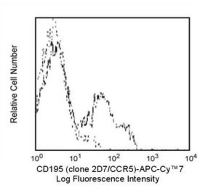 Reacts with the chemokine receptor, CCR5, a seven transmembrane-spanning G protein-associated molecule. CCR5 belongs to the β chemokine receptor family. It is expressed on a subset of T lymphocytes (CD3+, CD45RO+, CD95+). CCR5 regulates lymphocyte chemotaxis activation and transendothelial migration during inflammation. It signals a response to at least three chemokines: RANTES and macrophage inflammatory protein-1 (MIP-1) α and β. Additionally, CCR5 has been found to be a co-receptor for macrophage-tropic HIV-1 on CD4+ cells, a characteristic that is important in viral transmission. Reports indicate that individuals who have partial (heterozygous) or complete (homozygous) deletion of the CCR5 allele, demonstrate resistance to HIV infection. This antibody has been shown to block ligand and gp120 binding. It is also able to neutralize HIV infection. This antibody is routinely tested by flow cytometric analysis. Other applications were tested at BD Biosciences Pharmingen during antibody development only or reported in the literature.Host Species: MouseClone: 2D7/CCR5Isotype: IgG2a, κSpecies Reactivity: HumanFlow Cytometry, Functional Assay, Immunofluorescence