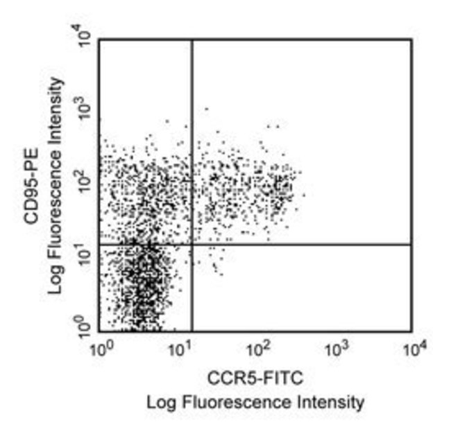 Reacts with the chemokine receptor, CCR5, a seven transmembrane-spanning G protein-associated molecule. CCR5 belongs to the β chemokine receptor family. It is expressed on a subset of T lymphocytes (CD3 , CD45RO , CD95 ). CCR5 regulates lymphocyte chemotaxis activation and transendothelial migration during inflammation. It signals a response to at least three chemokines: RANTES and macrophage inflammatory protein-1 (MIP-1) α and β. Additionally, CCR5 has been found to be a co-receptor for macrophage-tropic HIV-1 on CD4 cells, a characteristic that is important in viral transmission. Reports indicate that individuals who have partial (heterozygous) or complete (homozygous) deletion of the CCR5 allele, demonstrate resistance to HIV infection. This antibody has been shown to block ligand and gp120 binding. It is also able to neutralize HIV infection. This antibody is routinely tested by flow cytometric analysis. Other applications were tested at BD Biosciences Pharmingen during antibody development only or reported in the literature.Host Species: MouseClone: 2D7/CCR5Isotype: IgG2a κSpecies Reactivity: HumanFlow Cytometry