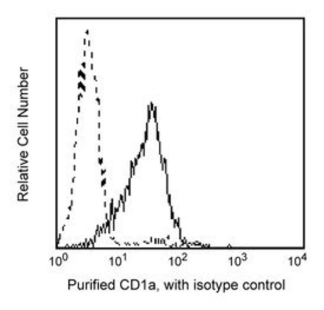 Reacts with a 49kDa polypeptide associated with β2-microglobulin. CD1a is expressed on cortical thymocytes, dendritic cells and Langerhans cells. CD1a has structural similarities to the MHC class I antigen, and plays a role in antigen presentation. This antibody is routinely tested by flow cytometric analysis. Other applications were tested at BD Biosciences Pharmingen during antibody development only or reported in the literature.