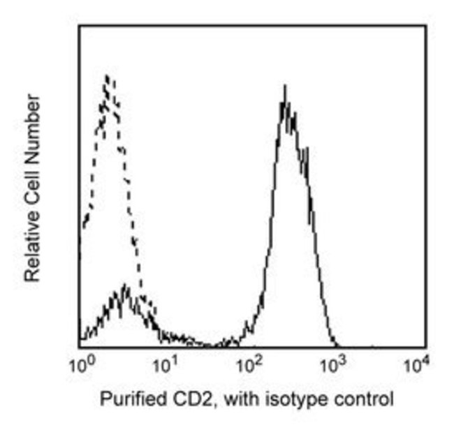 CD2 reacts with the 50kDa single-chain transmembrane glycoprotein, also known as LFA-2 or the receptor for sheep erythrocytes. CD2 belongs to the immunoglobulin superfamily of proteins along with its ligand LFA-3, CD58. It is present on about 80-90% of human peripheral blood lymphocytes, greater than 95% of thymocytes, all T lymphocytes that form E-rosettes and a subset of NK cells. CD2 plays a role in T-cell signaling and in lymphocyte adhesion. This antibody is routinely tested by flow cytometric analysis. Other applications were tested at BD Biosciences Pharmingen during antibody development only or reported in the literature.