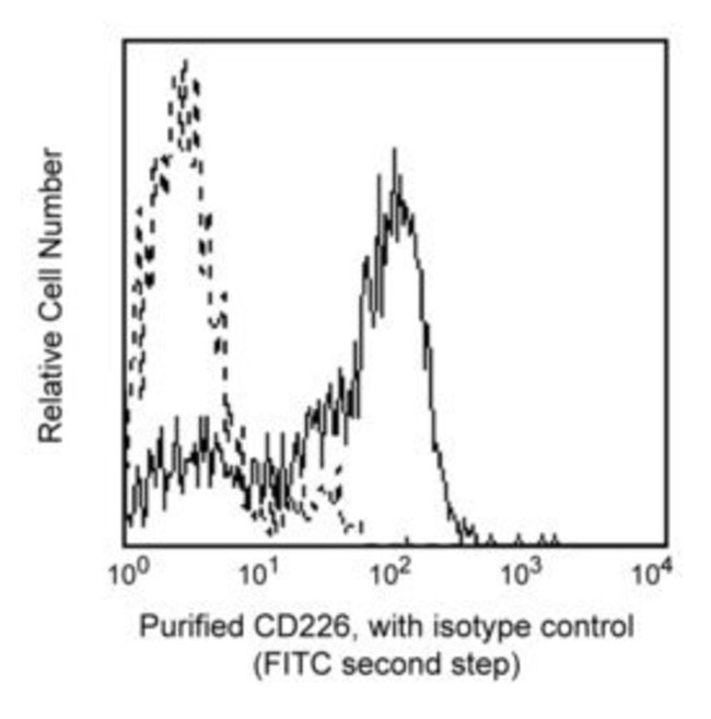 Reacts with DNAX accessory molecule-1 (DNAM-1), a 65kDa transmembrane glycoprotein consisting of 318 amino acid residues including two Ig-like domains. DNAM-1 is expressed on the majority of T cells, NK cells, monocytes, and a subset of B cells, but not on granulocytes or erythrocytes. It is also present on a subset of thymocytes coexpressing high density surface CD3. DNAM-1 is not present on normal fibroblast cell lines or tumor cell lines of epithelial or neuronal origins. DNAM-1 is a tyrosinephosphorylated, signal-transducing molecule which participates in primary adhesion during cytotoxic T lymphocyte (CTL)-mediated cytotoxicity. DX11 inhibits T- and NKcell-mediated cytotoxicity against a variety of tumor cell targets, and blocks cytokine production by alloantigen-specific T cells.Flow Cytometry