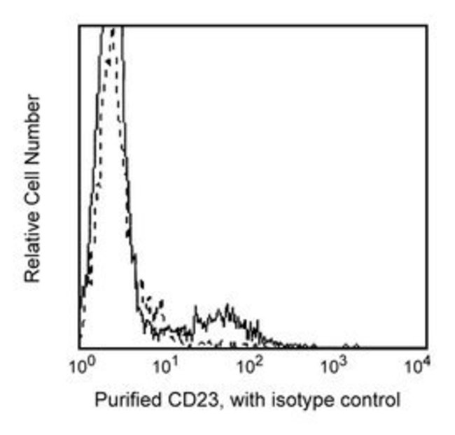 The M-L233 antibody reacts with the low affinity receptor for human IgE, FcεRII/CD23. CD23 is a type II membrane protein which can be expressed by B cells, monocytes, macrophages, eosinophils, platelets, and dendritic cells. CD23 can mediate IgE-dependent cytotoxicity and phagocytosis by macrophages and eosinophils. Soluble CD23 (sCD23) can be released by CD23+ cells as a result of proteolytic cleavage of membrane CD23. Larger fragments of sCD23 (e.g., 37-25kDa) retain their IgE-binding capacity whereas smaller fragments (i.e., <12kDa) do not. Soluble CD23 may have immunoregulatory effects on the growth and differentiation of B cells and other cell types.Host Species: MouseClone: M-L233Isotype: IgG1 κSpecies Reactivity: HumanImmunohistochemistry, Immunohistochemistry (Frozen)