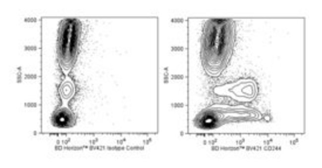 The 2-69 monoclonal antibody specifically binds to 2B4 which is also known as CD244. CD244 is an approximately 63-70 kDa type I transmembrane glycoprotein. It is a SLAM submember (SLAMF4) and CD2 family member of the immunoglobulin superfamily. CD244 was originally identified in the mouse as a non-MHC-restricted cytotoxicity mediator present on NK cells and CD8 T cells. In humans, CD244 is expressed on NK cells, γδ T cells, subsets of effector and memory CD8 T cells, monocytes, eosinophils and basophils. This expression pattern suggests a broad role for CD244 in the regulation of leukocyte activation. CD244 binds CD48 with high affinity. CD244 may serve both stimulatory and inhibitory functions depending on a number of factors. These include the intensity and duration of CD244 interactions with its ligands as well as the presence of other signals generated through different receptor-ligand interactions. 2B4 was clustered as CD244 in the VIIth HLDA workshop. The antibody was conjugated to BD Horizon BV421 which is part of the BD Horizon Brilliant™ Violet family of dyes. With an Ex Max of 407-nm and Em Max at 421-nm, BD Horizon BV421 can be excited by the violet laser and detected in the standard Pacific Blue™ filter set (eg, 450/50-nm filter). BD Horizon BV421 conjugates are very bright, often exhibiting a 10 fold improvement in brightness compared to Pacific Blue conjugates.