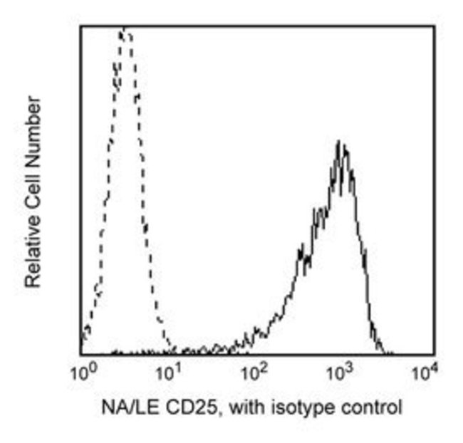 Reacts with CD25, a 55kDa glycoprotein known as the low-affinity interleukin-2 receptor (IL-2R). CD25 is expressed on activated lymphocytes (T and B) and monocytes, and associates with the p75 high-affinity receptor chain to form the IL-2R complex. The CD25 molecule reveals three epitope regions: A, B, and C. M-A251 antibody recognizes epitope region B. CD25 expression on lymphocytes is upregulated by anti-CD3 or PHA stimulation. Soluble IL-2R is produced following inflammatory responses. This antibody is routinely tested by flow cytometric analysis. Other applications were tested at BD Biosciences Pharmingen during antibody development only or reported in the literature.