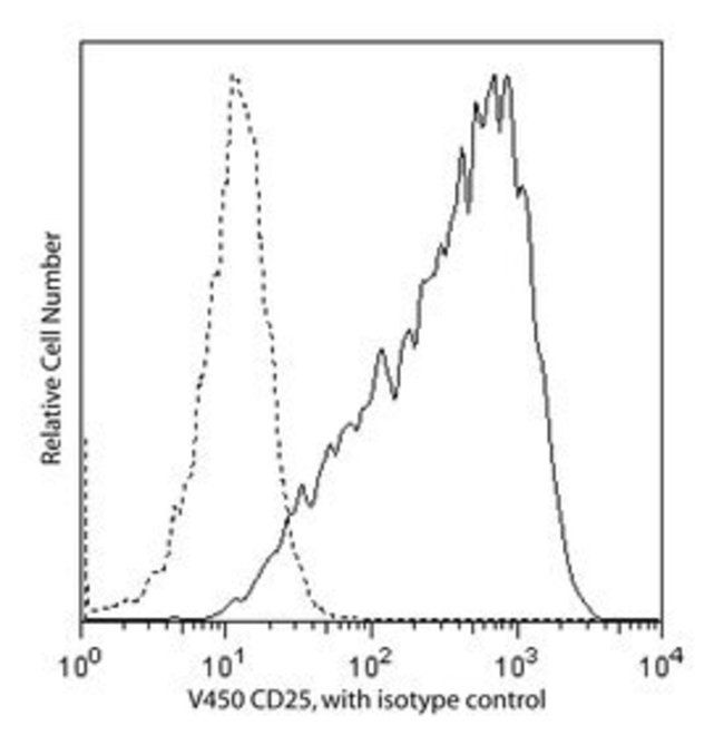 Reacts with CD25, a 55kDa glycoprotein known as the low-affinity interleukin-2 receptor (IL-2R). CD25 is expressed on activated lymphocytes (T and B) and monocytes, and associates with the p75 high-affinity receptor chain to form the IL-2R complex. The CD25 molecule reveals three epitope regions: A, B, and C. M-A251 antibody recognizes epitope region B. CD25 expression on lymphocytes is upregulated by anti-CD3 or PHA stimulation. Soluble IL-2R is produced following inflammatory responses. The antibody is conjugated to BD Horizon™ V450, which has been developed for use in multicolor flow cytometry experiments and is available exclusively from BD Biosciences. It is excited by the Violet laser Ex max of 406nm and has an Em Max at 450nm. Conjugates with BD Horizon™ V450 can be used in place of Pacific Blue™ conjugates.Host Species: MouseClone: M-A251Isotype: IgG1 κSpecies Reactivity: HumanFlow Cytometry, Functional Assay