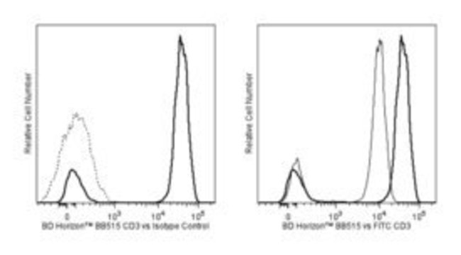 The HIT3a monoclonal antibody specifically binds to the human CD3 ε-chain, a 20 kDa subunit of the CD3/T cell antigen receptor complex found on 70-80% of normal human peripheral blood lymphocytes and 60-85% of thymocytes. Studies from the HLDA Workshop show that this antibody can be mitogenic for T lymphocytes. The CD3 complex plays a role in signal transduction during antigen recognition by the T cell receptor. HIT3a antibody does not stain intracellular CD3 unlike the other CD3-specific clone, UCHT1 (Cat. No. 555330/550368). The antibody was conjugated to BD Horizon BB515 which was developed exclusively by BD Biosciences. With an excitation max of 490nm and an emission max of 515nm, BD Horizon BB515 can be excited by the 488nm laser and detected in a standard FITC set (eg, 530/30-nm filter). This dye provides a much brighter alternative to FITC with less spillover into the PE detector.
