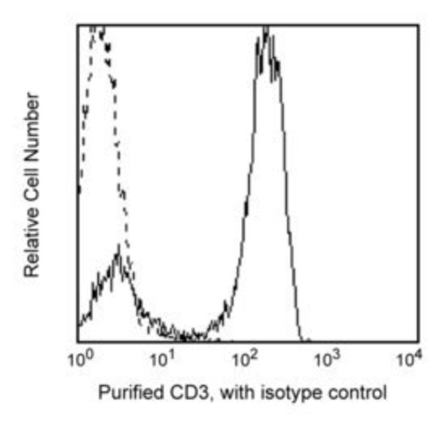 Reacts with the human ε-chain, a 20kDa subunit of CD3/T cell antigen receptor complex found on 70-80% of normal human peripheral blood lymphocytes and 60-85% of thymocytes. Studies from the HLDA Workshop show this antibody to be mitogenic when used in conjuction with pokeweed mitogen. CD3 plays a role in signal transduction during antigen recognition. HIT3a antibody does not stain intracellular CD3 unlike the other CD3 clone, UCHT1. This antibody is routinely tested by flow cytometric analysis. Other applications were tested at BD Biosciences Pharmingen during antibody development only or reported in the literature.