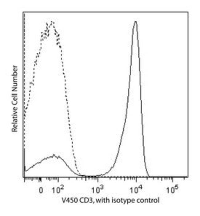 Clone SP34-2 is a mouse IgG1 isotype monoclonal antibody, descendant of SP34 (mouse IgG3), with the same specificity and reactivity pattern as the parent clone. It cross-reacts with a major subset of peripheral blood lymphocytes, but not monocytes or granulocytes, of baboon, and rhesus, cynomolgus, and pigtail macaque monkeys. The distribution on lymphocytes is similar to that observed with normal human donor lymphocytes with the majority of CD3-positive cells being negative when dual stained with antibodies to B or NK cells markers. SP34-2 is also capable of inducing cell proliferation on both human and non-human primate PBMC. The antibody is conjugated to BD Horizon™ V450, which has been developed for use in multicolor flow cytometry experiments and is available exclusively from BD Biosciences. It is excited by the Violet laser Ex max of 406nm and has an Em Max at 450nm. Conjugates with BD Horizon™ V450 can be used in place of Pacific Blue™ conjugates.Host Species: MouseClone: SP34-2Isotype: IgG1 λSpecies Reactivity: HumanFlow Cytometry
