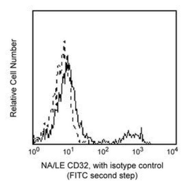 Reacts with FcγRII (CD32), a 40 kDa, polymorphic transmembranous glycoprotein, highly glycosylated molecule (encoded by at least two genes), expressed on monocytes, granulocytes, platelets and B cells. Unlike FLI28.6, 3D3 mAb detected a polymorphic CD32 antigen expressed on B cells of all donors, but only on platelets, monocytes and granulocytes of some donors. The platelets from 3D3 donors respond to certain stimulatory mAb such as CD165 (clone SN2, Cat. No. 556050) and result in aggregation. On the other hand, the platelets from 3D3 negative donors do not form aggregates after stimulation. Individuals can be divided into two groups as responder and non-responder depending on expression, or non-expression, of 3D3. In comparison to 3D3, FLI8.26 detects a monomorphic CD32 antigen expressed on all human donors. This antibody is routinely tested by flow cytometric analysis. Other applications were tested at BD Biosciences Pharmingen during antibody development only or reported in the literature.