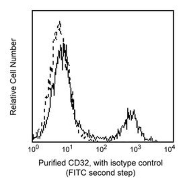 Reacts with FcγRII (CD32), a 40 kDa, polymorphic transmembranous glycoprotein, highly glycosylated molecule (encoded by at least two genes), expressed on monocytes, granulocytes, platelets and B cells. Unlike FLI28.6, 3D3 mAb detected a polymorphic CD32 antigen expressed on B cells of all donors, but only on platelets, monocytes and granulocytes of some donors. The platelets from 3D3 donors respond to certain stimulatory mAb such as CD165 (clone SN2, Cat. No. 556050) and result in aggregation. On the other hand, the platelets from 3D3 negative donors do not form aggregates after stimulation. Individuals can be divided into two groups as responder and non-responder depending on expression, or non-expression, of 3D3. In comparison to 3D3, FLI8.26 detects a monomorphic CD32 antigen expressed on all human donors. This antibody is routinely tested by flow cytometric analysis. Other applications were tested at BD Biosciences Pharmingen during antibody development only or reported in the literature.