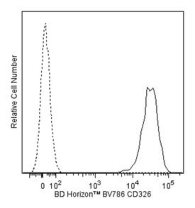 The EBA-1 monoclonal antibody specifically binds to human CD326. CD326 is an approximately 40 kDa type 1 transmembrane glycoprotein and adhesion molecule that mediates intercellular adhesive interactions. CD326 is also known as epithelial adhesion molecule (EpCAM), epithelial glycoprotein 2 (EGP-2), and epithelial surface antigen (ESA). The epithelial cells present in non-squamous epithelia and tumors derived from such cells show EpCAM expression. The normal epithelial cells reactive with anti-EpCAM antibodies are those present in the (lower) respiratory tract; the (lower) gastrointestinal tract; tubules in the kidney; the surface epithelium of the ovary; the exocrine and endocrine pancreas; secondary germ cells of telogenic hair follicles; and secretory tubules of sweat glands in the skin, whereas the epidermis is negative. In addition, all epithelial cells in the thyroid and epithelial cells in the thymus show EpCAM expression, while the outer cortex and Hassall’s corpuscles have low expression. In the liver, only the bile ducts appear to be positive with anti-EpCAM antibodies. Non-squamous- carcinoma cells have high EpCAM expression; some squamous carcinoma cells. Tumors arising from non-epithelial cells, such as lymphoma, mesothelioma, neuroblastoma, and melanoma, do not express EpCAM. The antibody was conjugated to BD Horizon BV786 which is part of the BD Horizon Brilliant™ Violet family of dyes. This dye is a tandem fluorochrome of BD Horizon BV421 with an Ex Max of 405-nm and an acceptor dye with an Em Max at 786-nm. BD Horizon BV786 can be excited by the violet laser and detected in a filter used to detect Cy™7-like dyes (eg, 780/60-nm filter).