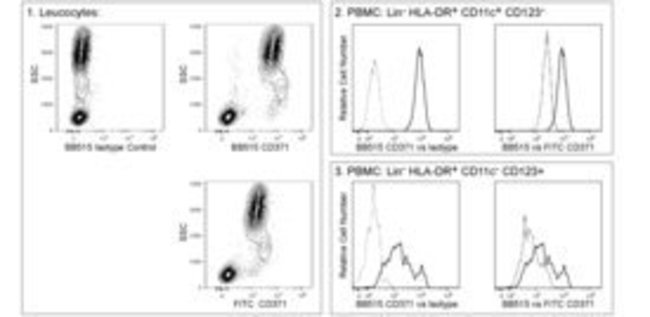 The 50C1 monoclonal antibody specifically binds to human CD371 which is also known as, Clec12A (C-type lectin domain family 12 member A), C-type lectin-like molecule 1 (CLL-1), myeloid inhibitory C-type lectin-like receptor (MICL), or dendritic cell-associated lectin 2 (DCAL-2). It is expressed on a variety of cells including monocytes, macrophages, dendritic cells, and granulocytes and perhaps some NK cells. Cleck12A is a member of the C-type lectin/C-type lectin-like domain (CTL/CTLD) superfamily. It is a 30 kDa type II transmembrane glycoprotein that has one single C-type lectin-like domain and one cytoplasmic immunoreceptor tyrosine-based inhibitory motif (ITIM). Clec12A has similarity with the β-glucan receptor (Dectin-1) and LOX-1 with high N-glycosyla tion. There are at least five isoforms due to alternative transcript splicing. Signaling through Clec12A can induce internalization of Cleck12A, dendritic cell maturation and the production of cytokines including IL-12. Clec12A may also serve as a negative regulator of activated leukocytes recruited to sites of inflammation. The antibody was conjugated to BD Horizon BB515 which was developed exclusively by BD Biosciences. With an excitation max of 490nm and an emission max of 515nm, BD Horizon BB515 can be excited by the 488nm laser and detected in a standard FITC set (eg, 530/30-nm filter). This dye provides a much brighter alternative to FITC with less spillover into the PE detector.