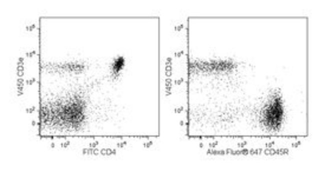 This antibody has been reported to react with the 25-kDa ε chain of the T-cell receptor-associated CD3 complex expressed on thymocytes, mature T lymphocytes, and NK-T cells on many mouse stains. Plate-bound and soluble hamster anti-mouse CD3e (clone 500A2) antibody has been reported to activate unprimed T cells in vitro. Activation of a mouse T-cell clone by soluble hamster anti-mouse CD3e (clone 500A2) can be blocked by Fab fragments of anti-CD4 antibody GK1.5, suggesting that the hamster anti-mouse CD3e (clone 500A2) antibody may bind an epitope of CD3e close to a site at which CD4 associates with the T-cell receptor. This hamster mAb to a mouse leukocyte antigen has been reported not to cross-react with rat leukocytes. The antibody is conjugated to BD Horizon™ V450, which has been developed for use in multicolor flow cytometry experiments and is available exclusively from BD Biosciences. It is excited by the 450 nm. Conjugates with BD Horizon™ V450 can be used in place of Pacific Blue™ conjugates.