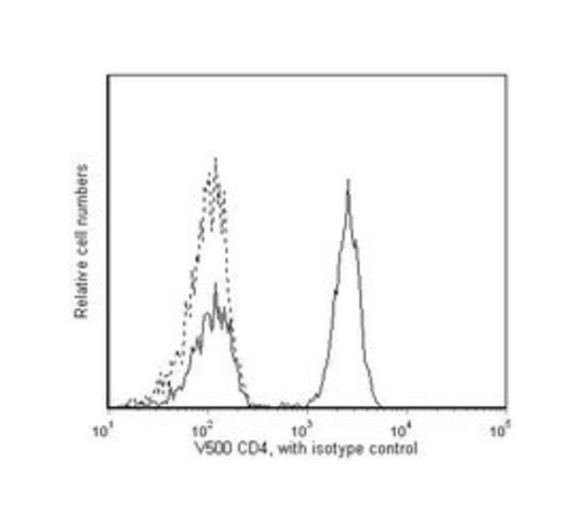 The RPA-T4 clone reacts with CD4, a 59kDa single-chain transmembrane glycoprotein [receptor for human immunodeficiency virus (HIV)] present on T-helper/inducer cell populations. This antibody binds to the D1 domain (CDR1 and CDR3 epitopes) of the CD4 antigen and reacts with approximately 80% of thymocytes and 45% of peripheral blood lymphocytes. CD4 is also present in low density on peripheral blood monocytes. RPA-T4 is capable of blocking HIV-1, gp120, and inhibits syncytium formation. The antibody is conjugated to BD Horizon™ V500, which has been developed for use in multicolor flow cytometry experiments and is available exclusively from BD Biosciences. It is excited by the Violet laser with an Ex max of 415 nm and Em Max at 500nm. BD Horizon V500 conjugates emit at a similar wavelength to Amcyan yet exhibit reduced spillover into the FITC channel. For more information on BD Horizon V500, visit bdbiosciences.com/colors. When compensating dyes in this spectral range (such as Horizon™ V500 and AmCyan), the most accurate compensation can be obtained using single stained cellular controls. Due to spectral differences between cells and beads in this channel, using BD CompBeads can result in spillover errors for V500 and AmCyan reagents. Therefore, the use of BD CompBeads or BD CompBeads Plus to determine spillover values for these reagents is not recommended. Different V500 reagents (e.g. CD4 vs. CD45) can have slightly different fluorescence spillover therefore, it may also be necessary to use clone specific compensation controls when using these reagents.Flow Cytometry