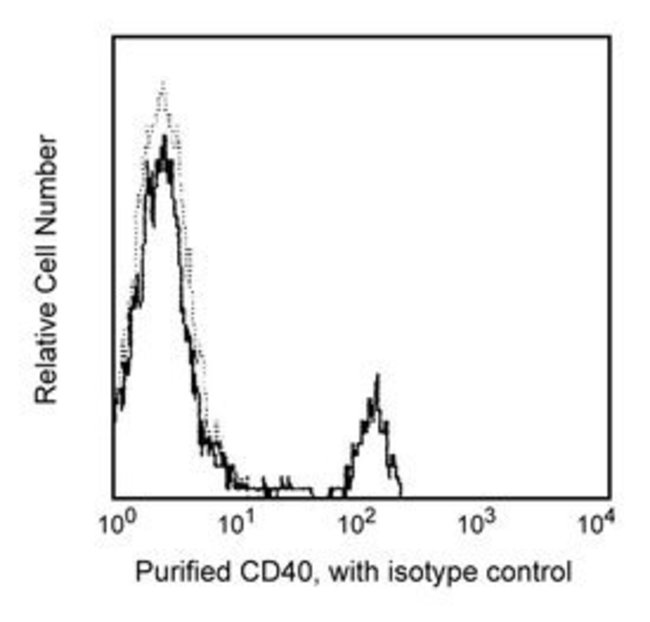 This antibody reacts with a 45-48kDa type I integral membrane glycoprotein present on peripheral blood and tonsillar B cells, but not expressed on terminally differentiated B cells. CD40 is also present on some epithelial cells, carcinomas and lymphoid dendritic cells. This antibody is useful for studies of B-cell growth and function. Anti-CD40 antibodies have been reported to stimulated B-cell proliferation when costimulated with anti-?, anti-CD20 antibodies or with phorbol esters. 5C3 is capable of inducing B-cell proliferation when presented with IL-4. This antibody is routinely tested by flow cytometric analysis. Other applications were tested at BD Biosciences Pharmingen during antibody development only.