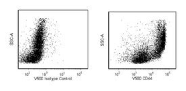 The IM7 antibody reacts with an epitope on both alloantigens and all isoforms of the CD44 glycoprotein (Pgp-1, Ly-24). The standard form of CD44, lacking variable exons and referred to as CD44H or CD44s, is widely expressed on hematopoietic and non-hematopoietic cells. CD44 isoforms encoded by variable exons are expressed on epithelial cells, but only at low levels on most leukocytes. Mice with the Ly-24.1alloantigen (e.g., BALB/c, CBA/J, DBA/1, DBA/2) have relatively large subsets of CD44H+ T lymphocytes, while Ly-24.2 strains (e.g., A, AKR, CBA/N, C3H/He, C57BL, C57BR, C57L, C58, NZB, SJL, SWR, 129) have few CD44H+ T cells. CD44 is a cell adhesion receptor, and its principal ligand, hyaluronate, is a common component of extracellular matrices. Differential glycosylation of CD44 influences its binding to hyaluronate. Additional ligands include the cell-surface form of CD74 and the cytokine osteopontin (Eta-1). Bone marrow- and thymus-derived progenitor cells capable of repopulating the thymus express CD44. In the periphery, the level of CD44 expression increases upon activation of B lymphocytes, CD4+ T cells, and CD8+ T cells; memory cells can be recognized by their CD44[hi] phenotype. The IM7 mAb inhibits established collagen-induced arthritis in DBA/1 mice. Moreover, it prevents CNS inflammation and clinical symptoms of experimental autoimmune encephalomyelitis. In contrast, the same antibody exacerbates experimental autoimmune thyroiditis in CBA/J mice. The IM7 mAb recognizes a different epitope from that recognized by mAb KM114, and the antibody pair can be used in ELISA to detect soluble CD44. It has been observed that IM7 antibody cross-reacts with human, dog, cat, horse, cow, and pig leukocytes. Anti-human CD44, clone G44-26, and IM7 antibody compete for binding to human peripheral blood lymphocytes. The antibody is conjugated to BD Horizon™ V500, which has been developed for use in multicolor flow cytometry experiments and is available exclusively from BD Biosciences. It is excited by the Violet laser with an Ex max of 415nm and Em Max at 500nm. BD Horizon V500 conjugates emit at a similar wavelength to Amcyan yet exhibit reduced spillover into the FITC channel. For more information on BD Horizon V500, visit bdbiosciences.com/colors. When compensating dyes in this spectral range (such as Horizon™ V500 and AmCyan), the most accurate compensation can be obtained using single stained cellular controls. Due to spectral differences between cells and beads in this channel, using BD CompBeads can result in spillover errors for V500 and AmCyan reagents. Therefore, the use of BD CompBeads or BD CompBeads Plus to determine spillover values for these reagents is not recommended. Different V500 reagents (e.g. CD4 vs. CD45) can have slightly different fluorescence spillover therefore, it may also be necessary to use clone specific compensation controls when using these reagents.Flow Cytometry