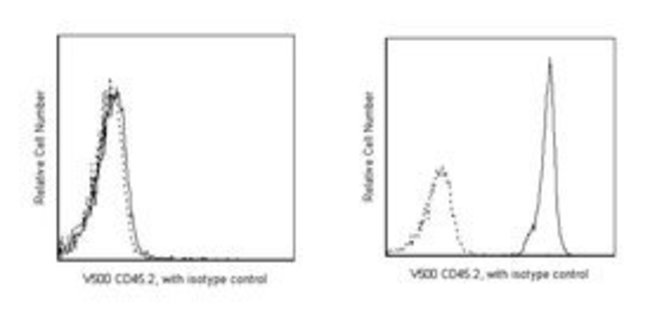 The 104 clone has been reported to react with CD45 (Leukocyte Common Antigen) on all leukocytes of most mouse strains (eg, A, AKR, BALB/c, CBA/Ca, CBA/J, C3H/He, C57BL, C57BR, C57L, C58, DBA/1, DBA/2, NZB, SWR, 129). This alloantigen was originally named Ly-5.1, and this was the designation at the time that the antibody was characterized. The designation was later changed from Ly-5.1 to Ly-5.2 to conform with the convention that the .2 alloantigen designations be assigned to the C57BL/6 strain. mAb 104 has been reported not to react with leukocytes of the mouse strains expressing the CD45.1 alloantigen (eg, RIII, SJL/J, STS/A, and DA). CD45 is a member of the Protein Tyrosine Phosphatase (PTP) family: its intracellular (COOH-terminal) region contains two PTP catalytic domains, and the extracellular region is highly variable due to alternative splicing of exons 4, 5, and 6 (designated A, B, and C, respectively), plus differing levels of glycosylation. The CD45 isoforms detected in the mouse are cell type-, maturation-, and activation state-specific. The CD45 isoforms play complex roles in T-cell and B-cell antigen receptor signal transduction. The 104 antibody has been reported to inhibit some responses of B cells, from mice expressing the CD45.2 alloantigen, to certain antigens and LPS. In addition, reduction of serum IgG levels and amelioration of autoimmune renal pathology were reported in mAb 104-treated systemic lupus erythematosus-prone mice. The antibody is conjugated to BD Horizon™ V500, which has been developed for use in multicolor flow cytometry experiments and is available exclusively from BD Biosciences. It is excited by the Violet laser with an Ex max of 415nm and Em Max at 500 nm. BD Horizon V500 conjugates emit at a similar wavelength to Amcyan yet exhibit reduced spillover into the FITC channel. When compensating dyes in this spectral range (such as Horizon™ V500 and AmCyan), the most accurate compensation can be obtained using single stained cellular controls. Due to spectral differences between cells and beadsin this channel, using BD CompBeads can result in spillover errors for V500 and AmCyan reagents.Therefore, the use of BD CompBeads or BD CompBeads Plus to determine spillover values for these reagents is not recommended.Different V500 reagents (e.g. CD4 vs. CD45) can have slightly different fluorescence spillover therefore, it may also be necessary to use clone specific compensation controls when using these reagents.