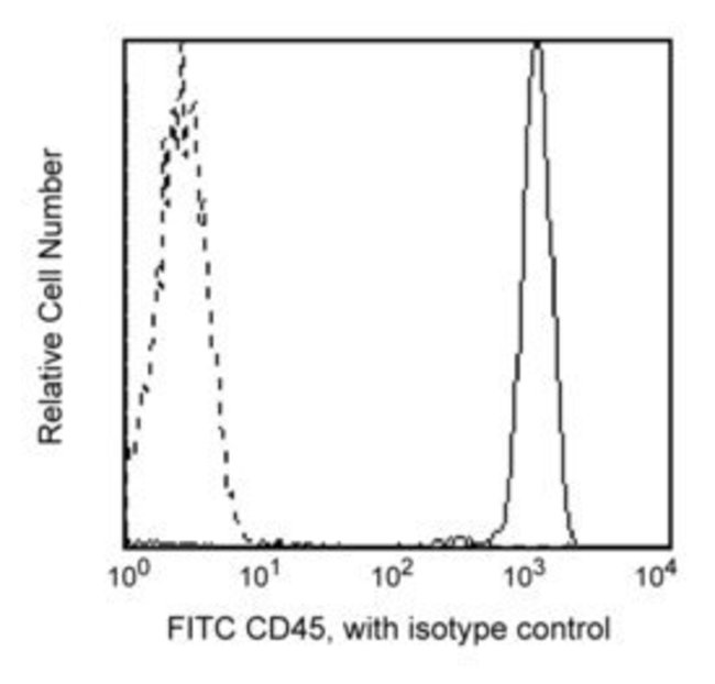 The HI30 monoclonal antibody specifically binds to the 180, 190, 205, 220 kDa protein isoforms of CD45. CD45 is encoded by the PTPRC (Protein tyrosine phosphatase receptor type C) gene. CD45, also known as the leukocyte common antigen (LCA), is a member of the protein tyrosine phosphatase (PTP) family. It is present on all human leukocytes including lymphocytes, monocytes, granulocytes, eosinophils, and thymocytes. CD45 is absent from circulating erythrocytes, platelets, or mature erythroid cells of bone marrow and non-hemopoietic tissues.