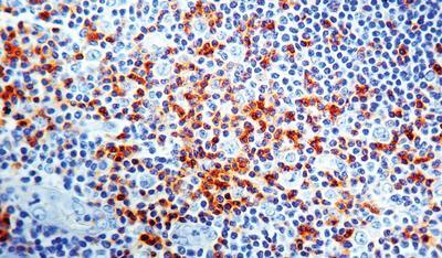 T Cell, CD45RO^ Clone number UCHL-1, This antibody reacts with a 180 kD glycoprotein of CD45 family, occurring on most thymocytes and activated T cells but only on the portion of the resting T cells. It reacts with most thymocytes, a subpopulation of resting cells within both the CD4 and CD8 subsets and mature activated T cells.