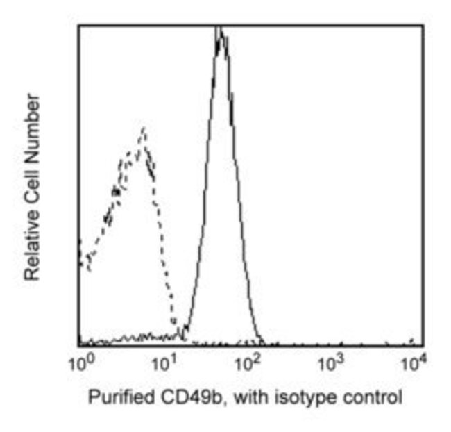Reacts with integrin α2 chain (VLA-α2), a member of the integrin family of extracellular matrix and cell-cell adhesion receptors. VLA-α2 is non-covalently associated with VLA-β1 chain (CD29) in the VLA-2 complex. α2 is expressed on numerous cell types including activated T cells, platelets, and long-term cultivated T cells. α2β1 is a well-established receptor for collagen. This antibody is useful for studies of integrin expression and function. This antibody is routinely tested by flow cytometric analysis. Other applications were tested at BD Biosciences Pharmingen during antibody development only or reported in the literature.