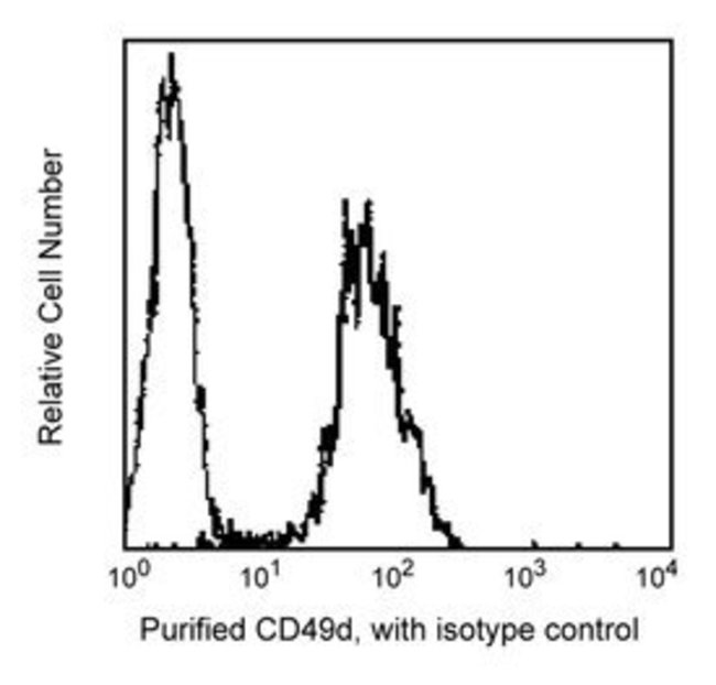 Reaacts with the integrin α4 chain, which is expressed as a heterodimer with either of two β subunits, β1 (CD29) or β7. The α4β 1 integrin (VLA-4) is expressed on lymphocytes, monocytes, thymocytes, NK cells, and several B- and T-cell lines, and mediates binding to VCAM-1 (CD106) and the CS-1 region of fibronectin. The α4β7 integrin has a similar tissue distribution, except it is found on only a small subpopulation of thymocytes. Integrin α4β7 also binds fibronectin and VCAM-1, and has been shown in the mouse to preferentially bind the mucosal vascular addressin molecule, MAdCAM-1. This antibody is useful for studies of the expression and function of a4 chain-containing integrins. This antibody is routinely tested by flow cytometric analysis. Other applications were tested at BD Biosciences Pharmingen during antibody development only or reported in the literature.
