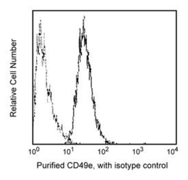 Reacts with the α5 integrin, a dimer of 135/25kDa, that associates with β1 integrin (CD29) to form VLA-5, a well-established fibronectin receptor that is expressed on many cell types, including fibroblasts, endothelial cells, epithelial cells, platelets, peripheral T cells, the myeloid cell line U937, K562 and some melanoma cell lines. This clone inhibits α5β1/ligand binding, and is useful for studies of the expression and function of this integrin. This antibody is routinely tested by flow cytometric analysis. Other applications were tested at BD Biosciences Pharmingen during antibody development only or reported in the literature.