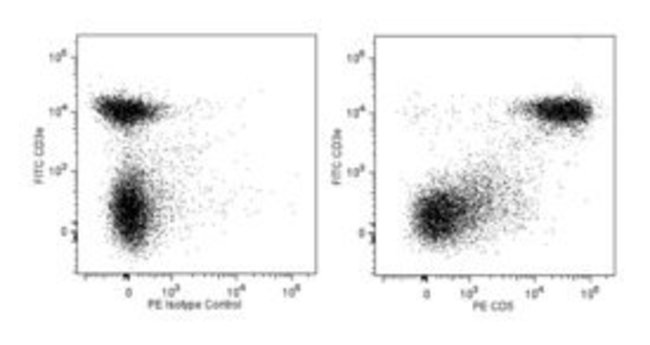 The 53-7.3 clone has been reported to react with a monomorphic epitope of CD5, a member of the scavenger receptor cysteine-rich protein superfamily and the major ligand of CD72, found on thymocytes, T lymphocytes, thymic NK-T cells, and a subset of B lymphocytes, but not on NK cells or splenic NK-T cells. The level of surface CD5 expression is developmentally regulated in the thymus, starting with low levels on CD4-CD8- thymocytes and increasing as they mature to CD4+CD8+ then CD4+CD8- or CD4-CD8+ thymocytes. Relatively high levels are maintained on peripheral T lymphocytes. The level of CD5 antigen detected on T helper cells has been reported to be somewhat higher than that on T cytotoxic/suppressor and B cells. Few, if any, intestinal intraepithelial lymphocytes bearing the γδ T-cell receptor express CD5. Phenotypic, anatomical, functional, developmental, and pathogenic characteristics of peripheral CD5+ B cells suggest that they may represent a distinct lineage, known as B-1 cells. The frequency of these CD5+ B cells has been reported to show strain-dependent variation. An additional population of CD5+ B lymphocytes resides in the thymus, where it matures from intrathymic B-cell progenitors. It has been proposed that CD5 is a costimulatory molecule which mediates interactions of cells in the immune system and negatively regulates signal transduction mediated by the T-cell receptor and B-cell receptor. This antibody is routinely tested by flow cytometric analysis. Other applications were tested at BD Biosciences Pharmingen during antibody development only or reported in the literature.Host Species: RatClone: 53-7.3Isotype: IgG2a κSpecies Reactivity: MouseImmunogen: Mouse Thymus / SpleenFlow Cytometry