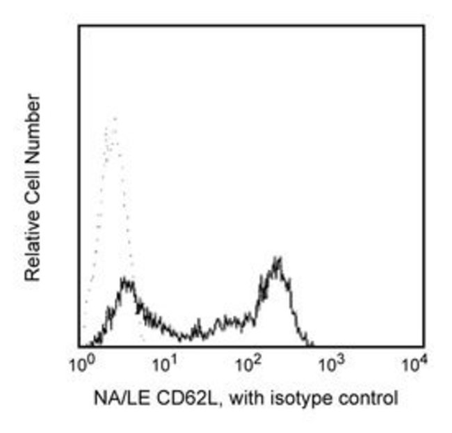 Reacts with a 76-95kDa glycoprotein referred to as L-selectin or LECAM-1. CD62L is expressed on neutrophils, monocytes, T- and B-lymphocyte subsets and NK cells. Dreg-56 antibody recognizes the same antigen as LAM-1, and specifically inhibits >90% of binding of human lymphocytes to high endothelial venules (HEV) in frozen sections of peripheral, but not mucosal lymphoid tissue. It thus defines L-selectin as a human lymphocyte homing receptor for peripheral lymph node HEV. This antibody is routinely tested by flow cytometric analysis. Other applications were tested at BD Biosciences Pharmingen during antibody development only or reported in the literature.
