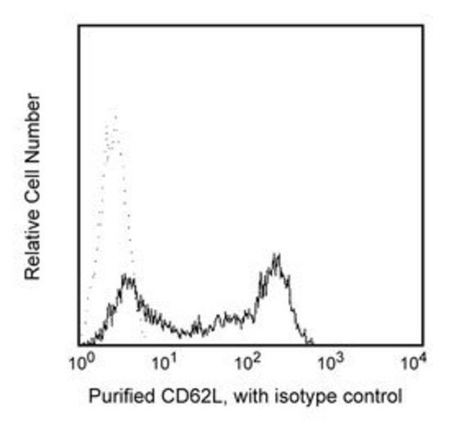 Reacts with a 76-95kDa glycoprotein referred to as L-selectin or LECAM-1. CD62L is expressed on neutrophils, monocytes, T- and B-lymphocyte subsets and NK cells. Dreg-56 antibody recognizes the same antigen as LAM-1, and specifically inhibits >90% of binding of human lymphocytes to high endothelial venules (HEV) in frozen sections of peripheral, but not mucosal lymphoid tissue. It thus defines L-selectin as a human lymphocyte homing receptor for peripheral lymph node HEV. This antibody is routinely tested by flow cytometric analysis. Other applications were tested at BD Biosciences Pharmingen during antibody development only or reported in the literature.