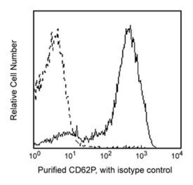 Reacts with the human form of the 140kDa membrane glycoprotein, P-selectin, formerly known as platelet activation-dependent granule external membrane protein (PADGEM), or granule membrane protein (GMP-140). P-selectin is stored in the α-granules of platelets and the Weibel-Palade bodies of endothelial cells, and is rapidly transported to the plasma membrane upon activation. P-selectin is thought to mediate the initial adhesive interactions of neutrophils and monocytes with endothelium in inflammatory responses, and of activated platelets to neutrophils and monocytes in hemostasis. This antibody is a non-blocking monoclonal antibody and is suitable for immunohistochemical staining of formalin-fixed, paraffin embedded, tissue sections. Clone AC1.2 also cross reacts with activated platelets of baboon, and both rhesus and cynomolgus macaque monkeys. The reactivity on resting and activated platelets is similar to that observed on resting and activated platelets of human donors.