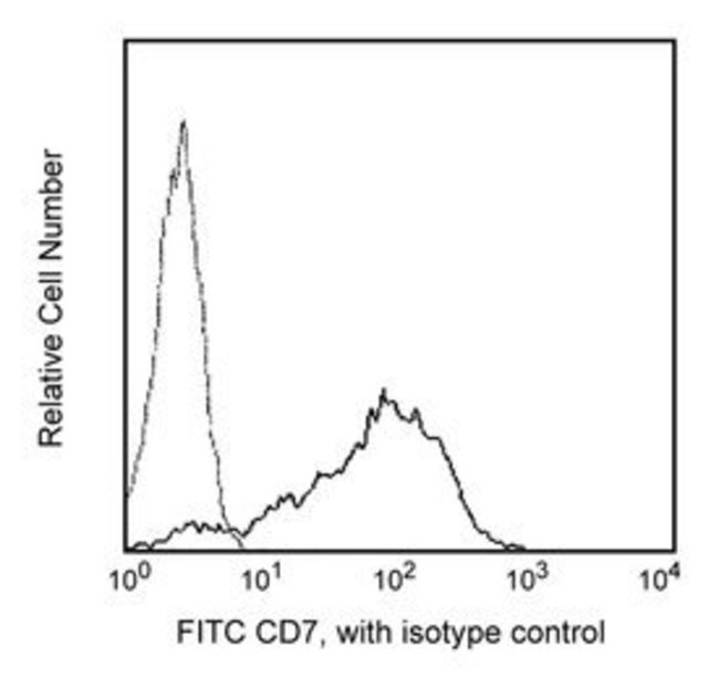 The M-T701 monoclonal antibody specifically binds to CD7. CD7 is a 40 kDa type I transmembrane glycoprotein that belongs to the immunoglobulin superfamily. The CD7 antigen is also known as Leu-9, TP41, Tp40, GP40, and T-cell leukemia antigen. It is expressed on thymocytes, T cells, pre-B cells, and NK cells. CD7 is present in reduced density on monocytic cells and cell lines. Functional studies demonstrate that crosslinking of the CD7 can induce transmembrane calcium flux in T cells.