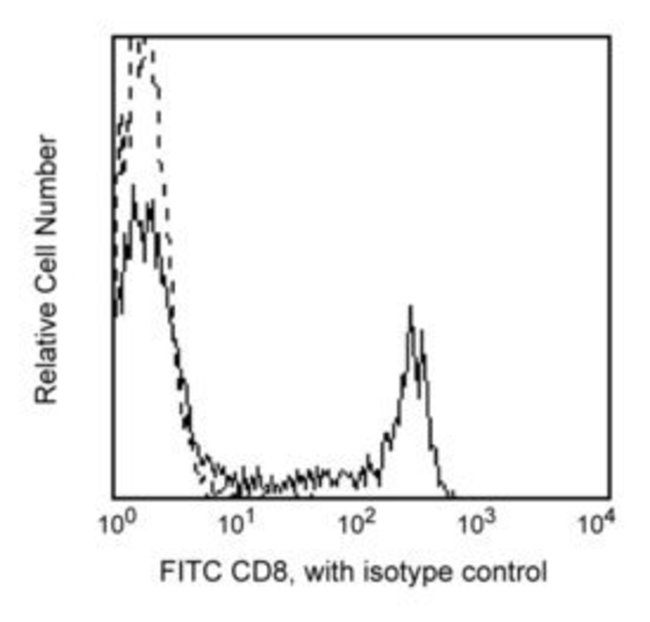 Clone RPA-T8 reacts with the α subunit (32kDa) of the two-chain complex expressed on T-cytoxic/suppressor cell populations. CD8 molecule binds to HLA class I molecules during interaction of CD8+ T cells with antigen-presenting cells or with target cells. RPA-T8 reacts with approximately 13-48% of peripheral blood lymphocytes and 80% of thymocytes, as well as a subset of NK cells. RPA-T8 and HIT8a are not cross-blocking. This antibody is routinely tested by flow cytometric analysis. Other applications were tested at BD Biosciences Pharmingen during antibody development only or reported in the literature.Host Species: MouseClone: RPA-T8Isotype: IgG1, κCross Reactivity: Baboon, CynomolgusFlow Cytometry
