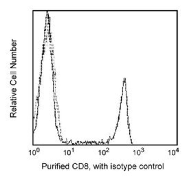 Reacts with the α subunit (32 kDa) of the two-chain complex. CD8 molecule binds to HLA class I molecules during interaction of CD8+ T cells with antigen-presenting cells or with target cells. CD8 is expressed on T cytotoxic/suppressor cell populations. HIT8a stains approximately 13 - 48% of peripheral blood lymphocytes and 80% of thymocytes, as well as a subset of NK cells. Clones HIT8a and RPA-T8 (Cat. No. 555364) are not cross-blocking. This antibody is routinely tested by flow cytometric analysis. Other applications were tested at BD Biosciences Pharmingen during antibody development only or reported in the literature.