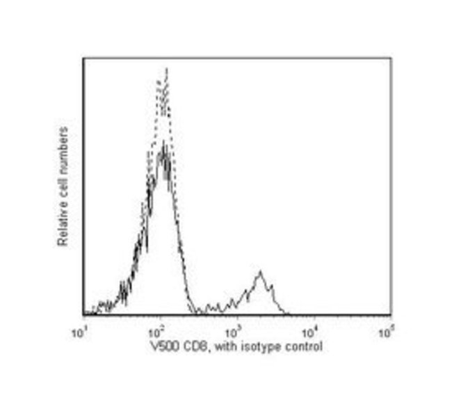 Clone RPA-T8 reacts with the α subunit (32kDa) of the two-chain complex expressed on T-cytoxic/suppressor cell populations. CD8 molecule binds to HLA class I molecules during interaction of CD8+ T cells with antigen-presenting cells or with target cells. RPA-T8 reacts with approximately 13-48% of peripheral blood lymphocytes and 80% of thymocytes, as well as a subset of NK cells. RPA-T8 and HIT8a (Mfr. No. 555337) are not cross-blocking. The antibody is conjugated to BD Horizon™ V500, which has been developed for use in multicolor flow cytometry experiments and is available exclusively from BD Biosciences. It is excited by the Violet laser with an Ex max of 415nm and Em Max at 500nm. BD Horizon V500 conjugates emit at a similar wavelength to Amcyan yet exhibit reduced spillover into the FITC channel. For more information on BD Horizon V500, visit bdbiosciences.com/colors. When compensating dyes in this spectral range (such as Horizon™ V500 and AmCyan), the most accurate compensation can be obtained using single stained cellular controls. Due to spectral differences between cells and beads in this channel, using BD CompBeads can result in spillover errors for V500 and AmCyan reagents. Therefore, the use of BD CompBeads or BD CompBeads Plus to determine spillover values for these reagents is not recommended. Different V500 reagents (e.g. CD4 vs. CD45) can have slightly different fluorescence spillover therefore, it may also be necessary to use clone specific compensation controls when using these reagents.Flow Cytometry