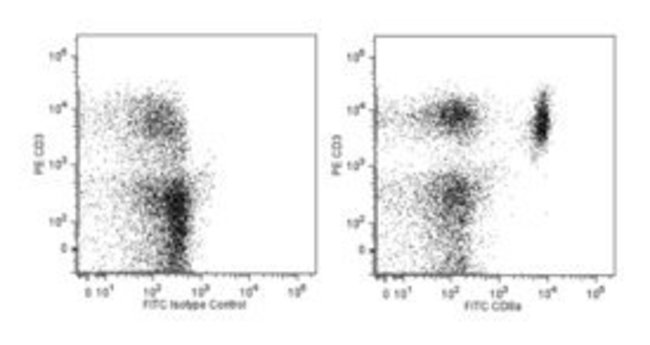 The 53-6.7 antibody has been reported to react with the 38 kDa α and 34 kDa α' chains of the CD8 differentiation antigen (Ly-2 or Lyt-2) of all mouse strains tested. The CD8 α and α' chains (CD8a) form heterodimers with the CD8 β chain (CD8b, Ly-3, or Lyt-3) on the surface of most thymocytes. A subpopulation of mature T lymphocytes (i.e., MHC class I-restricted T cells, including most T suppressor/cytotoxic cells) expresses almost exclusively the CD8 αβ heterodimer (the α' chain is absent). Subsets of γδ TCR-bearing T cells, intestinal intrapithelial lymphocytes, and dendritic cells express CD8a without CD8b. It has been suggested that the expression of the CD8a/CD8b heterodimer is restricted to T lymphocytes which matured in the thymus or in an extrathymic environment that had been influenced by thymus-initiated neuroendocrine signals. CD8 is an antigen coreceptor on the T-cell surface which interacts with MHC class I molecules on antigen-presenting cells or epithelial cells. It participates in T-cell activation through its association with the T-cell receptor complex and protein tyrosine kinase lck (p56 lck). The CD8 α and α' chains arise from alternatively spliced messengers of a single CD8a gene. The longer α form associates with p56 (lck) via a CXCP motif in its cytoplasmic domain, which it shares with CD4, but not with CD8b. The truncated α' chain is unable to associate with p56 (lck), and it may function to attenuate the CD8-mediated costimulatory signal during intrathymic T-cell maturation. In vivo and in vitro treatment with 53-6.7 mAb has reportedly been effective at depleting CD8+ peripheral T lymphocytes. The 53-6.7 antibody has also been reported to cross-reaact with CD8 α- and α'-like polypeptides on subsets of thymic and peripheral lymphocytes in the Egyptian toad, Bufo regularis. This antibody is routinely tested by flow cytometric analysis. Other applications were tested at BD Biosciences Pharmingen during antibody development only or reported in the literature.Host Species: RatClone: 53-6.7Isotype: IgG2a κSpecies Reactivity: MouseImmunogen: Mouse Thymus / SpleenFlow Cytometry