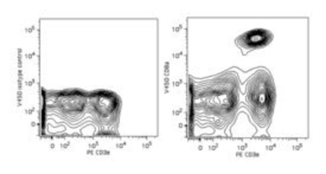 The 53-6.7 antibody has been reported to react with the 38kDa α and 34kDa α' chains of the CD8 differentiation antigen (Ly-2 or Lyt-2) of all mouse strains tested. The CD8 α and α' chains (CD8a) form heterodimers with the CD8 β chain (CD8b, Ly-3, or Lyt-3) on the surface of most thymocytes. A subpopulation of mature T lymphocytes (i.e., MHC class I-restricted T cells, including most T suppressor/cytotoxic cells) expresses almost exclusively the CD8 αβ heterodimer (the α' chain is absent). Subsets of γδ TCR-bearing T cells, intestinal intrapithelial lymphocytes, and dendritic cells express CD8a without CD8b. It has been suggested that the expression of the CD8a/CD8b heterodimer is restricted to T lymphocytes which matured in the thymus or in an extrathymic environment that had been influenced by thymus-initiated neuroendocrine signals. CD8 is an antigen coreceptor on the T-cell surface which interacts with MHC class I molecules on antigen-presenting cells or epithelial cells. It participates in T-cell activation through its association with the T-cell receptor complex and protein tyrosine kinase lck (p56 (lck)). The CD8 α and α' chains arise from alternatively spliced messengers of a single CD8a gene. The longer α form associates with p56 (lck) via a CXCP motif in its cytoplasmic domain, which it shares with CD4, but not with CD8b. The truncated α' chain is unable to associate with p56 (lck), and it may function to attenuate the CD8-mediated costimulatory signal during intrathymic T-cell maturation. In vivo and in vitro treatment with 53-6.7 mAb has reportedly been effective at depleting CD8+ peripheral T lymphocytes. The 53-6.7 antibody has also been reported to cross-reaact with CD8 α- and α'-like polypeptides on subsets of thymic and peripheral lymphocytes in the Egyptian toad, Bufo regularis. The antibody is conjugated to BD Horizon™ V450, which has been developed for use in multicolor flow cytometry experiments and is available exclusively from BD Biosciences. It is excited by the Violet laser Ex max of 406nm and has an Em Max at 450nm. Conjugates with BD Horizon™ V450 can be used in place of Pacific Blue™ conjugates.Host Species: RatClone: 53-6.7Isotype: IgG2a κSpecies Reactivity: MouseImmunogen: Mouse thymus / spleen CellsFlow Cytometry
