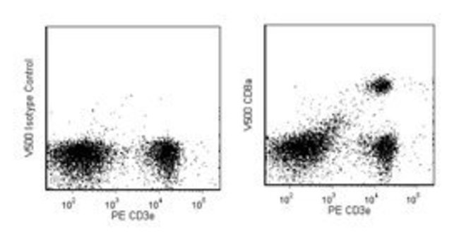 The 53-6.7 antibody has been reported to react with the 38kDa α and 34kDa α' chains of the CD8 differentiation antigen (Ly-2 or Lyt-2) of all mouse strains tested. The CD8 α and α' chains (CD8a) form heterodimers with the CD8 β chain (CD8b, Ly-3, or Lyt-3) on the surface of most thymocytes. A subpopulation of mature T lymphocytes (i.e., MHC class I-restricted T cells, including most T suppressor/cytotoxic cells) expresses almost exclusively the CD8 αβ heterodimer (the α' chain is absent). Subsets of γδ TCR-bearing T cells, intestinal intrapithelial lymphocytes, and dendritic cells express CD8a without CD8b. It has been suggested that the expression of the CD8a/CD8b heterodimer is restricted to T lymphocytes which matured in the thymus or in an extrathymic environment that had been influenced by thymus-initiated neuroendocrine signals. CD8 is an antigen coreceptor on the T-cell surface which interacts with MHC class I molecules on antigen-presenting cells or epithelial cells. It participates in T-cell activation through its association with the T-cell receptor complex and protein tyrosine kinase lck (p56 lck). The CD8 α and α' chains arise from alternatively spliced messengers of a single CD8a gene. The longer α form associates with p56 (lck) via a CXCP motif in its cytoplasmic domain, which it shares with CD4, but not with CD8b. The truncated α' chain is unable to associate with p56 (lck), and it may function to attenuate the CD8-mediated costimulatory signal during intrathymic T-cell maturation. In vivo and in vitro treatment with 53-6.7 mAb has reportedly been effective at depleting CD8+ peripheral T lymphocytes. The 53-6.7 antibody has also been reported to cross-reaact with CD8 α- and α'-like polypeptides on subsets of thymic and peripheral lymphocytes in the Egyptian toad, Bufo regularis. The antibody is conjugated to BD Horizon V500, which has been developed for use in multicolor flow cytometry experiments and is available exclusively from BD Biosciences. It is excited by the Violet laser with an Ex max of 415 nm and Em Max at 500 nm. BD Horizon V500 conjugates emit at a similar wavelength to Amcyan yet exhibit reduced spillover into the FITC channel. When compensating dyes in this spectral range (such as Horizon™ V500 and AmCyan), the most accurate compensation can be obtained using single stained cellular controls. Due to spectral differences between cells and beads in this channel, using BD CompBeads can result in spillover errors for V500 and AmCyan reagents. Therefore, the use of BD CompBeads or BD CompBeads Plus to determine spillover values for these reagents is not recommended. Different V500 reagents (e.g. CD4 vs. CD45) can have slightly different fluorescence spillover therefore, it may also be necessary to use clone specific compensation controls when using these reagents.Host Species: RatClone: 53-6.7Isotype: IgG2a κSpecies Reactivity: MsImmunogen: Mouse thymus / spleen CellsFlow Cytometry