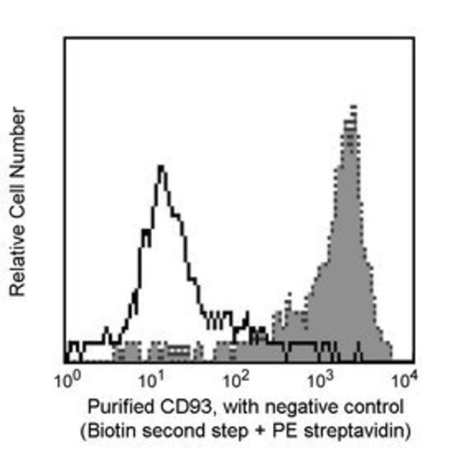 The immunogen used to raise R139 antibody was C1q-binding protein preparation derived from U937 cell lysates, as described. Human CDw93 (C1qRp) is a 631 AA, single chain type I membrane glycoprotein expressed on cells of myeloid origin, endothelial cells, and hematopoietic progenitor cells. Human, murine and rat protein sequences have been deduced from cDNA clones and are known to be similar in sequence and organization. CDw93 (C1qRp) binds C1q, the recognition subunit of the first component (C1) of the complement pathway, as well as MBL (Mannose-binding-lectin) and SPA (Pulmonary Surfactant Protein A). Multivalent interaction of CDw93 (C1qRp) expressing cells with C1q, MBL, and SPA, induces enhancement of phagocytosis of suboptimally opsonized particles and/or cellular debris. Antibody R139 neutralizes/blocks C1q-mediated enhancement of phagocytosis, as reported. In addition clone R139 is suitable to detect CDw93 (C1qRp) expression on cells by flow cytometry, CDw93 (C1qRp) in cellular lysates by Western blotting or immunoprecipitation. CDw93 (C1qRp) has been reported to define a human stem cell population with hematopoietic and hepatic potential.