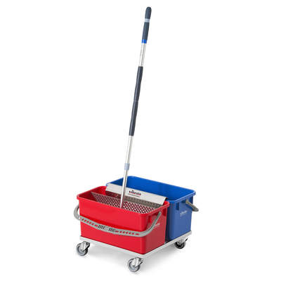 Bucket^ Double bucket dolly, Traditional cleaning trolley are simply too large and inconvenient in these areas. The solution is the new cleanroom bucket system. Single or double bucket option and sieve available separately. High performance even in compact cleanroom