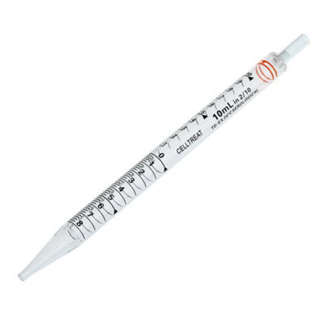Serological Pipet, 10mL, Short Pipet, Polystyrene, Individually Wrapped in Paper/Plastic, Packed in Bags. CELLTREAT Scientific Products. Dark, clear graduations. Premium plug material. Sterile (gamma irradiated). 50/Bag, 200/CS.