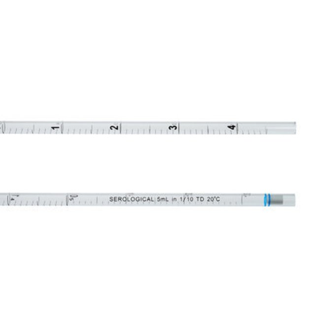 Serological Pipet, 5mL, Open End Pipet, Polystyrene, Individually Wrapped in Paper/Plastic, Packed in Bags. CELLTREAT Scientific Products. Dark, clear graduations. Premium plug material. Sterile (gamma irradiated). 50/Bag, 200/CS.